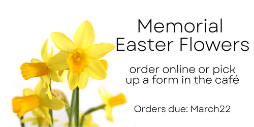 Plants ($8 each - 6" potted tulips, daffodils, or hyacinths) may be taken home after the worship services Easter Sunday.